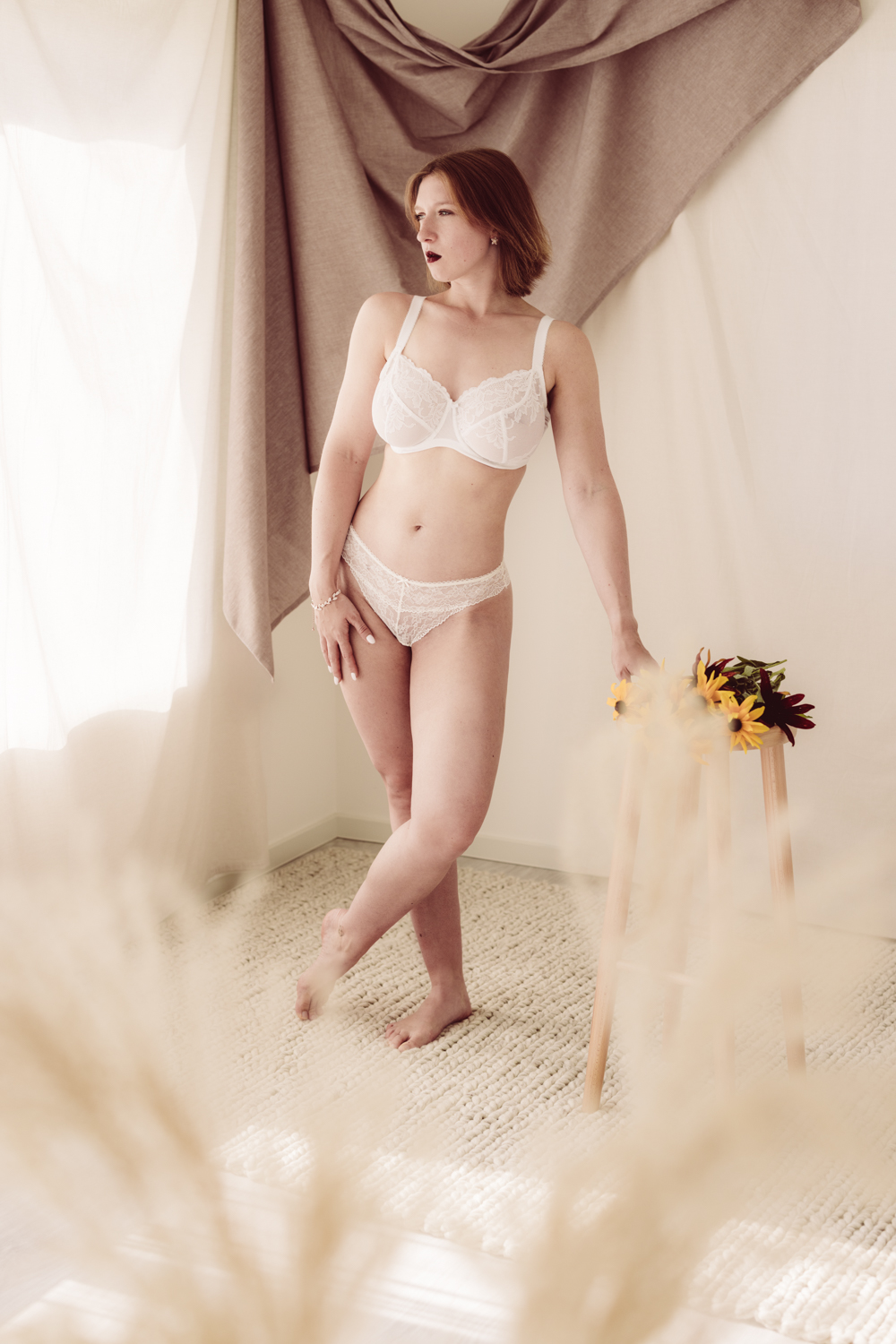 Ein kleines Highlight dieses Shootings: Wir bauten frische Blumen aus meinem Garten ein, die zusammen mit heller Wäsche und kräftigen Lippenfarben wunderschöne, abwechslungsreiche Akzente setzten. So entstanden Bilder, die mal sinnlich und verspielt, mal stark und selbstbewusst sind – ganz so, wie es zu meiner Kundin passte.