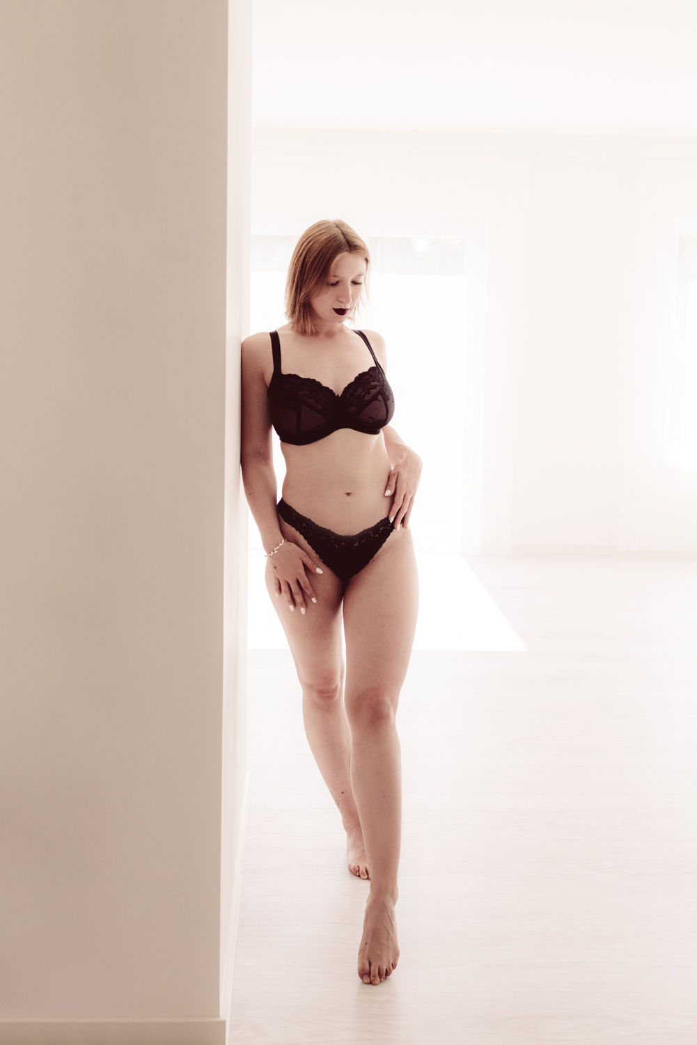 Wir starteten ganz entspannt mit einer Bluse – perfekt, um langsam in das Fotoshooting hineinzufinden. Schon nach kurzer Zeit wechselte sie in ihr erstes Wäscheset. Je länger wir fotografierten, desto wohler fühlte sie sich, desto freier und selbstbewusster wirkte sie vor meiner Kamera.